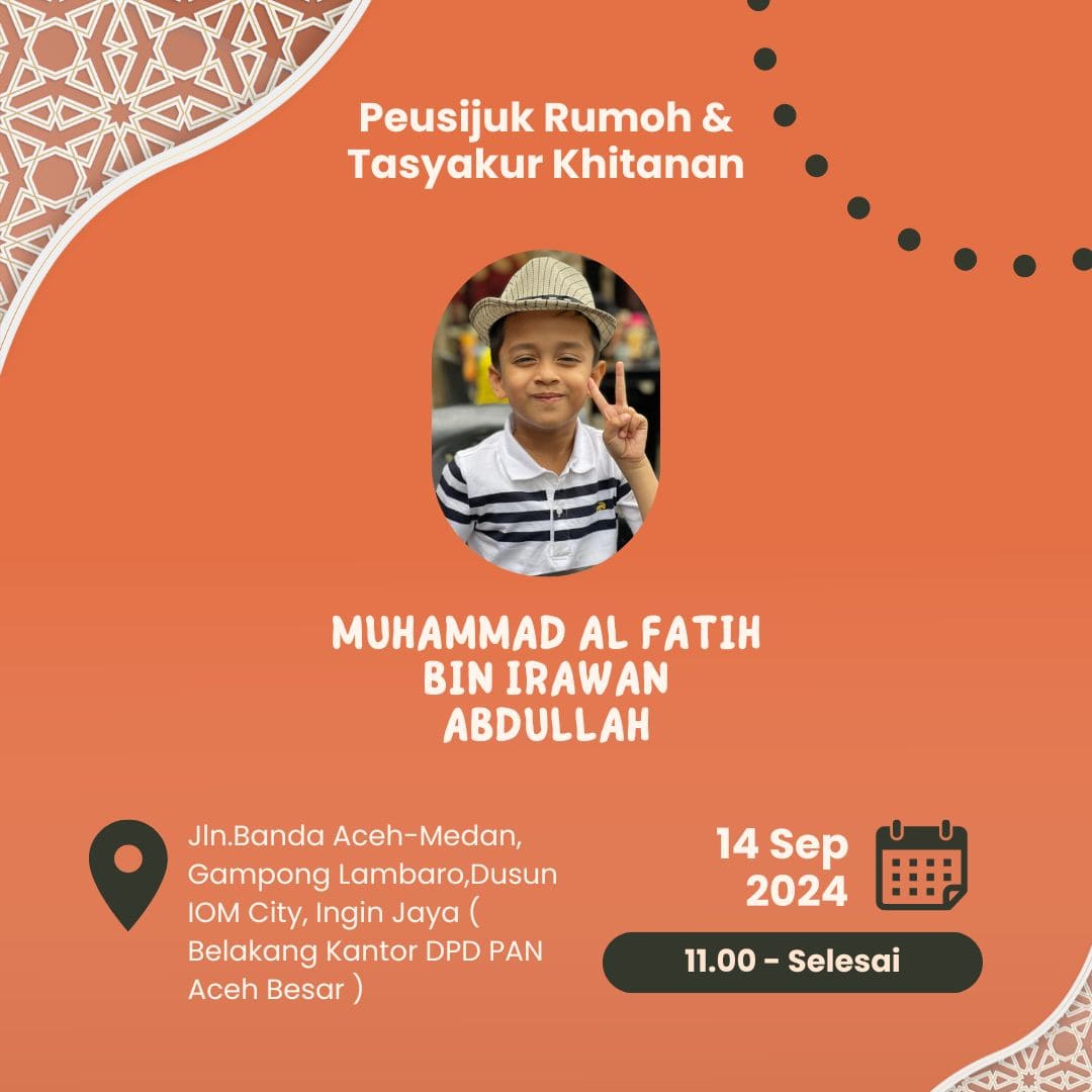 Dengan izin Allah SWT, dan dengan penuh kerendahan hati, kami bermaksud mengundang Bapak/Ibu/Saudara/i untuk berkenan hadir dalam acara Khanduri Peusijuk Rumoh dan Syukuran Khitan